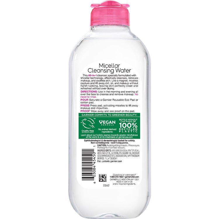 Garnier Micellar Cleansing Water All-in-1 is a gentle yet powerful cleanser that removes makeup and impurities without harsh rubbing or rinsing. The micelles in the formula act like magnets to capture dirt, oil, and makeup, leaving your skin perfectly clean and refreshed without drying it out.